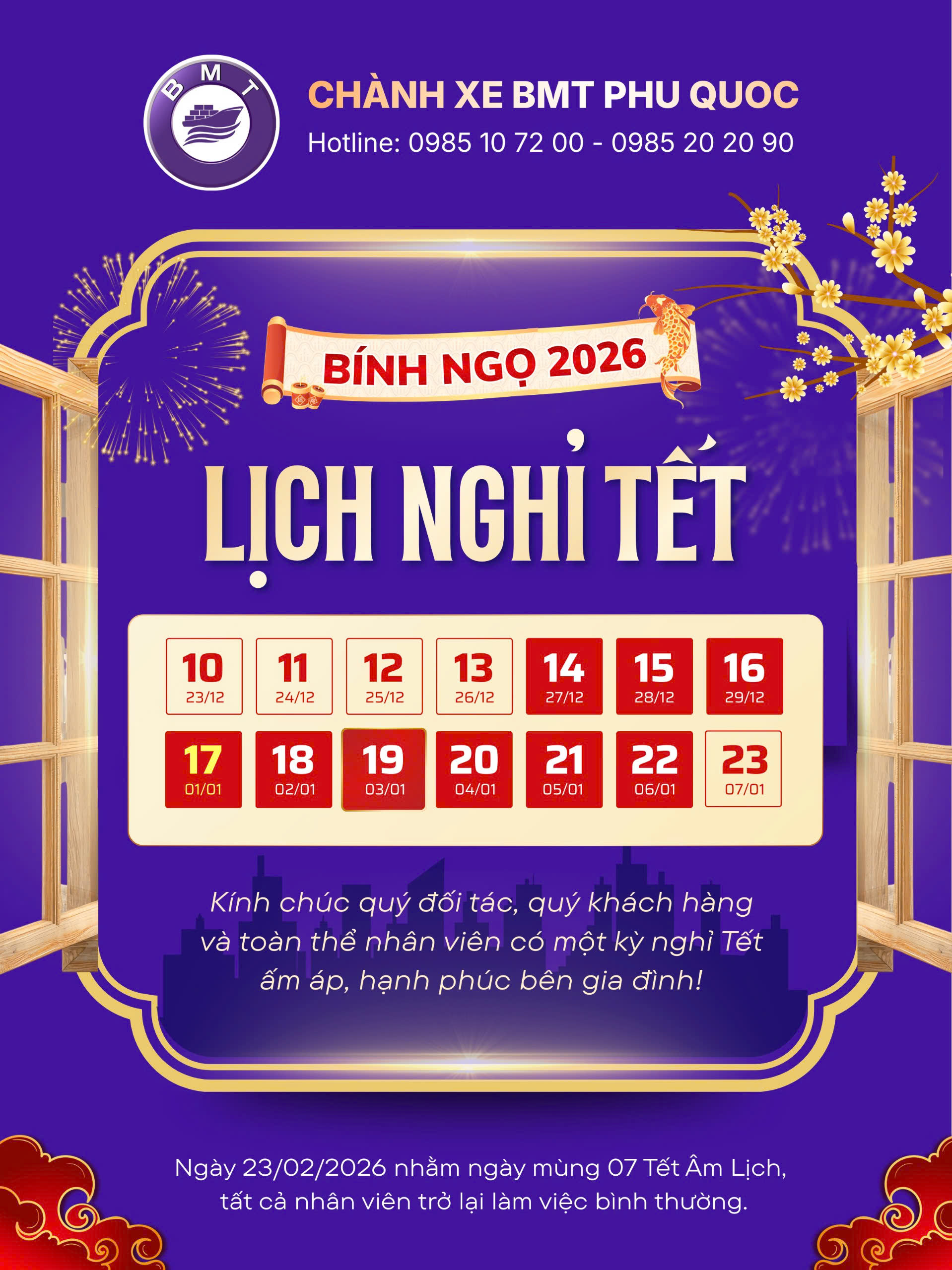 Tin tức BMT Phu Quoc Thông báo nghỉ lễ Tết Bính Ngọ 2026 | 0985 20 20 90 Chúc Quý khách hàng/ đối tác, CBNV và người thân 1 kỳ nghỉ Tết ấm áp, hạnh phúc bên gia đình.